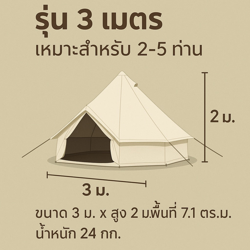 3 เมตร | 2–5 ท่าน | ~3 ม. | ~2 ม. | ~7.1 ตร.ม. | ~24 กก. |