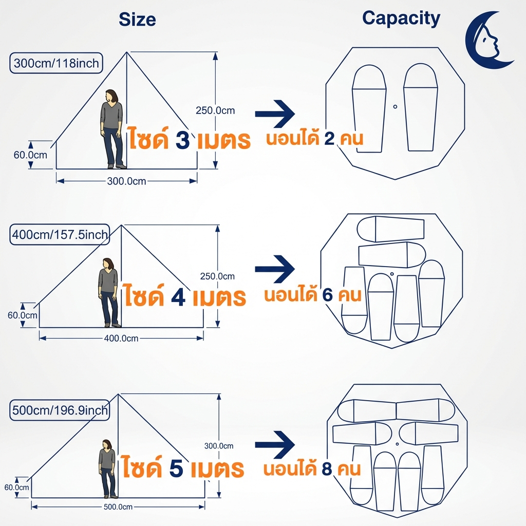 | 4 เมตร | 5-8 ท่าน | สูง 2.5 เมตร, พื้นที่ 12.6 ตร.ม. เหมาะสำหรับครอบครัวขนาดกลาง |